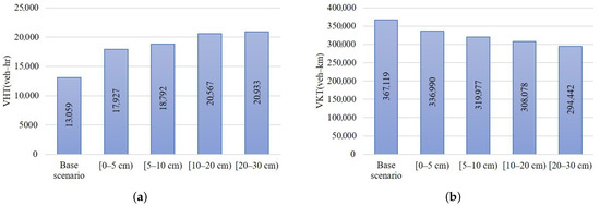 Figure 8 compares the base scenario (dry situation) and flood scenarios. The network indicator evaluation clearly explains that, when floods occur, VHT (Figure 8) increases, and VKT (Figure 8b) in the network decreases because the number of vehicles entering and exiting the network decreases.