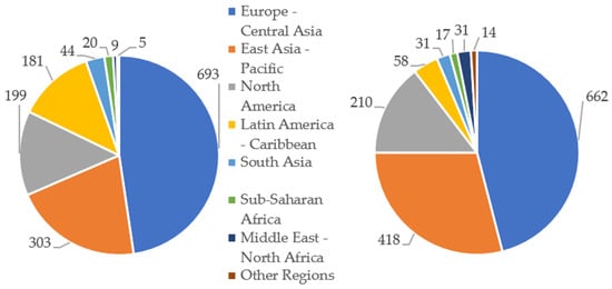 Since 2010, the global agri-food trade fluctuated between USD 14.2 (2010) and 18.0 (2018) billion per year and its share reached almost 10% of the global trade in 2020 [18]. The size of this market highlights the importance of being competitive; therefore, earning higher export revenues. The distribution of export and import is somewhat similar as the first three regions in terms of value are the same: Europe–Central Asia, East Asia–Pacific, and North America (Figure 1). This regional classification follows the system of the World Bank’s World Integrated Trade Solution (WITS). Another remarkable piece of information from the figure is the trade balance of these regions. Latin America is the most significant net exporter of agri-food products (USD +123 billion), while East Asia–Pacific is the most significant net importer among the regions with a USD 115 billion trade deficit. Besides Latin America, Europe–Central Asia, South Asia, and Sub-Saharan Africa have a trade surplus; all the other regions were net importers of agri-food products in 2020.