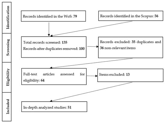 For the selection procedure, the Scopus and Web of Science (WoS) databases were searched. The keywords of the selection were agri-food, trade, and competitiveness with the Boolean operator AND between them. In order to obtain high quality articles, the selection was restricted to scientific and review articles. Besides the English language, no other restrictions were applied for the selection, e.g., there was no restriction on the date of publication. For the selection procedure, the PRISMA (Preferred Reporting Items for Systematic reviews and Meta-Analyses) method was used [19]. A total of 79 articles were identified in the Web of Science, while the Scopus database provided 56 potential articles. At the screening stage, 35 duplications and 36 non-relevant records were sorted out. The common characteristic of the non-relevant records was the lack of a proper analysis of one of the keywords. Most of them concentrated on different policy issues and sustainability. Although the language was restricted to English, 6 articles had only their abstracts in English. This resulted in 64 articles for the eligibility stage. By assessing their full texts, 13 more articles were excluded due to the following reasons: