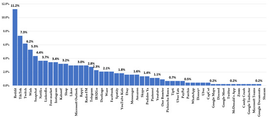 Figure 2 shows the accessibility issues of the evaluated mobile applications; the issues are summarized in column E of Table 3. Figure 2 shows the percentage of accessibility errors in the applications evaluated; the most accessible is Shazam, followed by Google Documents, Microsoft Teams, Google Traductor, Candy Crush, Zoom, McDonald’s App, Twitter, Google Meet, Discord, and Google Maps. The applications with the most accessibility issues are Reddit with 11.2%, followed by TikTok with 7.3%, Twitch with 6.2%, Wish with 5.3%, Snapchat with 4.4%, Netflix and LinkedIn with 3.7%, the rest of the applications are between 3.7% and 0.2%.