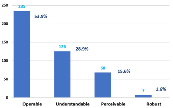 Most of the application problems related to contrast are related to the perceptible principle with 15.6%, where visually impaired people are involved, 7:1 is for large text, 4.5:1 is for standard text [26]. Less incidence of errors was detected for the robust principle with 1.6%.
