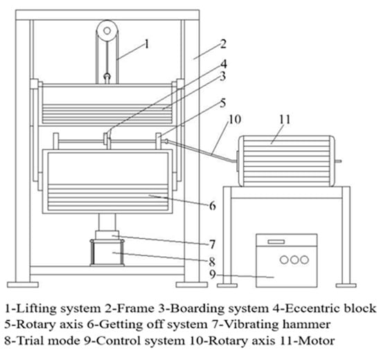 To fully simulate the rolling effect of modern heavy vibratory rollers, Chinese researchers have developed a laboratory vibratory compactor based on the principle of directional vibratory rollers. As shown in Figure 2, the vibratory compactor is mainly composed of three parts: the control platform, the rotating device and the vibration system. The vibration system is the most important part of the vibratory compactor, which is mainly composed of the frame, the vibrating entity and the vibrating hammer. Among them, the vibration entity is designed to imitate the vibration device of a vibratory roller, and is divided into vibration exciter, boarding system, and getting off system. The exciter is the core component of the vibration system. It consists of two parallel vibration shafts and a set of eccentric blocks mounted on them. The eccentric blocks on the two vibration shafts are arranged symmetrically. The eccentric blocks on each axis consist of a fixed eccentric block and a movable eccentric block. Composition to achieve the purpose of adjustable eccentricity. The boarding and getting off systems are connected by the vibration damping block, and the getting off system receives regular vibration through the restraining effect of the boarding system [].