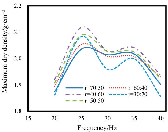 The vibrating hammer can vibrate up or down under the action of the transfer of the eccentric block, and it applies a periodic vibration force to the material to be compacted. The frequency is related to the natural frequency of the material to be compacted. The vibration frequency was varied to compact SRM with different soil–rock ratios (r), and the maximum dry density was obtained. The results were shown in Figure 3. It can be seen from the results that the maximum dry density of SRM increases rapidly with the increasing vibration frequency when the frequency is rather small, achieves the maximum peak when the frequency is 25 Hz, and then gradually decreases to a small valley when the frequency is 28 Hz. Then, it increases to a second peak at 35 Hz and, finally, quickly decreases. Previous research showed that when the vibration frequency of the road roller is times of natural frequency of the compacted materials [], resonance easily occurs, and the compaction effect is best. The natural frequency of SRM is approximately 17~20 Hz, and thus the corresponding optimal vibration frequency of the equipment for SRM is 24~28 Hz. When the vibration frequency is small, the compaction effect increases with the frequency, and the maximum dry density becomes larger. When the vibration frequency exceeds 28 Hz, the difference between the vibration frequency and the natural frequency of SRM is large, and the compaction effect is weakened. In summary, in order to achieve higher maximum dry density, the vibration frequency is recommended as 25 Hz for SRM.