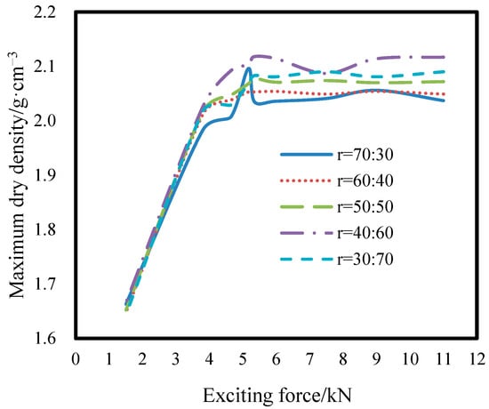 Different exciting forces can be obtained by adjusting the angle of the eccentric block. The maximum dry densities of SRM under different exciting forces were shown in Figure 4. It can be seen from Figure 4 that the maximum dry density of SRM increases rapidly with increasing exciting force when the exciting force is small and increases gradually as the exciting force further increases. When the exciting force exceeds 5.0 kN, the increase in maximum dry density is extremely gentle. A large exciting force does not mean that the compaction effect is good. Only the appropriate exciting force with the correct amplitude and frequency can achieve a better compaction effect. In general, the larger the angle of the eccentric block, the larger the amplitude, which not only affects the service life of the device but also causes the surface of the specimens to be uneven. Through experiments, it is found that when the angle of the eccentric block is 0~30°, the amplitude is within the optimal range of 1.25 ± 0.05 mm, the surface of the specimens is flat, and the compaction effect is well guaranteed. Therefore, the angle of the eccentric block is recommended as zero, and the corresponding exciting force is determined as 5.3 kN.