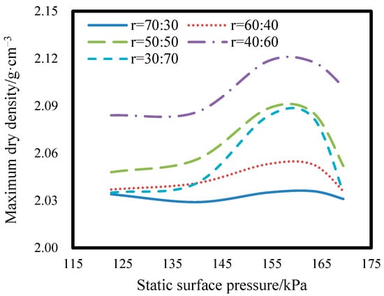 Different static surface pressures can be obtained by adjusting the number of clump weights []. The maximum dry densities of SRM under different static surface pressures are shown in Figure 5. It can be seen from Figure 5 that the pattern of maximum dry density of SRM is shown as a convex type of parabola with the increasing static pressure. A peak occurs at the weights of S4X7 and S5X9 (S4X7 represents four and seven clump weights, respectively, on the upper system and nether system). At the same time, it is found during the test that the vibratory compactor shakes sharply when the counterweight is small. As the number of clump weights increases, the body of the vibratory compactor jumps smoothly and is in a stable working state. If the number of clump weights or static surface pressures is too large, it is difficult for the nether system to jump, and the decrease in amplitude is too large, resulting in poor contact between the pressure head and the specimens. For comprehensive consideration, the recommended weight is S4X7 or S5X9, and the recommended static surface pressure is 154.0~163.2 kPa.
