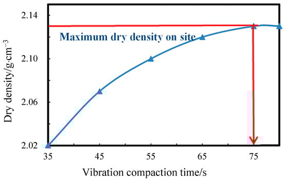Step 5: VCM was used to perform indoor vibration compaction at different times (35 s, 45 s, 55 s, 65 s, and 75 s), and the results were compared with the density of the SMR subgrade after on-site compaction. The recommended vibration compaction time was determined as the time when the indoor density reaches the on-site density. A 20 t single-drum vibratory roller was used for on-site compaction, and the rolling process was follows: static pressing 1 pass and then vibrating pressing 6 passes.
