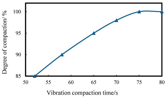 It can be seen from the results that the dry density of SRM increases first with the increase in the vibration time and then gradually stabilizes. If the maximum dry density of SRM is equal to the dry density at the site, then the vibration compaction time of SRM is 75 s. Therefore, it is determined that the laboratory vibration compaction time of SRM is 75 s. To facilitate the control of the compaction degree at the construction site, the relationship between the compaction degree and the vibration compaction time was studied in the laboratory. The vibration time of specimens required for different compaction degree were presented in Figure 7 and Table 3.