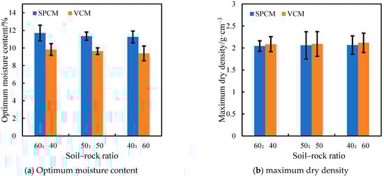 The specimens with different mass ratios of soil to rock were produced using the VCM and SPCM, and the results of optimum moisture content and maximum dry density are shown in Figure 8. As shown in Figure 8, the maximum dry density of SRM specimens produced using VCM is 1.021 ± 0.005 times that of the specimens produced using SPCM, and the optimum moisture content of the specimens produced using VCM is 0.84 ± 0.01 times that of the specimens produced using SPCM. The reason for this result is that, under the impact of vibratory compaction, the compacted granular materials transition from the initial stationary state to the moving state, the interaction between the particles transitions from static friction to dynamic friction or sliding friction, and the particles move relative to each other. The coarse particles are in closer contact, and the fine aggregate fills the voids made by the coarse aggregate; at the same time, under the action of the vibration force, the water aggregates to form a water film to provide lubrication for the relative motion between the particles, resulting in the particles being more easily compacted.
