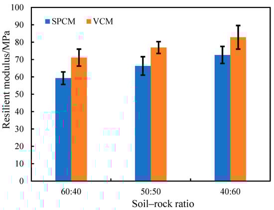 The specimens were prepared with the SPCM and VCM for soil–rock ratios of 60:40, 50:50, and 40:60. The resilient modulus of the specimens was measured, and the results are shown in Figure 9. As shown in Figure 9, the resilient modulus of the specimens prepared by the VCM is approximately 1.16 ± 0.03 times that of the specimens prepared by the SPCM. This reason is that the mechanical strength of SRM is closely related to the compaction degree.