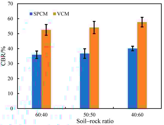The specimens were prepared by the SPCM and VCM and the CBR test of the prepared specimens was carried out. The results are shown in Figure 10. As shown in Figure 10, the CBR of the specimens prepared by the VCM is approximately 1.46 ± 0.02 times that of the specimens prepared by the SPCM. The higher the maximum dry density, the less it will be affected by water, the stronger the resistance to unit load penetration, and the greater the CBR.