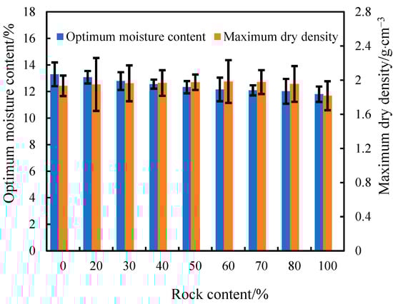 Figure 11 shows the maximum dry density and optimum moisture content of SRM with different ratios of soil to rock produced by the VCM. The results show that the optimum moisture content gradually decreases as the rock content increases, which is caused by the reason that the soil particle has bigger specific surface area than rock particle. The maximum dry density initially increases and then decreases with the increasing the rock content and achieves the peak when the rock content is 60%. This phenomenon can be attributed to the spatial structure of SRM []. When the soil ratio in SRM is lager, the rock particles do not mutually contact with each other and are surrounded with soil particles, and a called suspended dense structure appears in SRM. When the soil ratio in SRM is 30–50%, the voids between the rock particles are completely filled by the soil particles, and the rock particles are close to or in contact with each other, finally, a called skeletal dense structure appears in SRM. When the soil ratio in SRM is smaller than 30% and the voids between the rock particles cannot be completely filled by the soil particles, a called skeletal void structure appears and the density decreases.