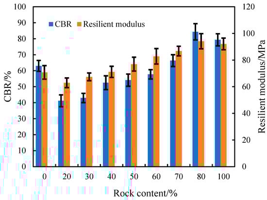 Figure 12 shows the resilient modulus and CBR of SRM produced by the VCM with different soil–rock ratio. It can be seen from Figure 12 that the resilient modulus and CBR of SRM with a rock content of zero is larger that of SRM with a rock content of 20%. When the rock content exceeds 20%, the resilient modulus and CBR of SRM vary in a convex curve with the increasing the rock content and achieve the maximum peak when the rock content is 80%. The mechanical strength of SRM is closely related with the density and structure of SRM. It can be known from Figure 11 that the density of SRM increases initially and then decreases as the rock content increases, and the structure of SRM varies in sequence: suspended dense and skeletal dense. Therefore, the variation in resilient modulus of SRM is influenced by both the density and structure.