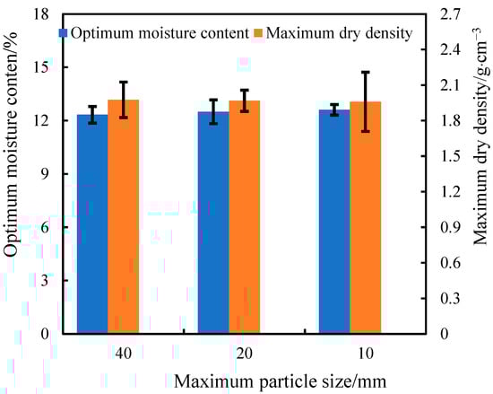 Figure 13 shows the results of maximum dry density and optimum moisture content of SRM with different maximum particle size produced by the VCM. It can be concluded that the maximum dry density gradually increases with the maximum particle size increasing; on the contrary, the optimum water content gradually decreases. The reason for this phenomenon is that, as the particle size increases, the specific surface area of the mixture decreases relatively, and the water requirement for lubricating the particles also decreases. Meanwhile, the number of rock particles in SRM decreases, meaning that a framework dense structure is easily formed, and the density is increased.