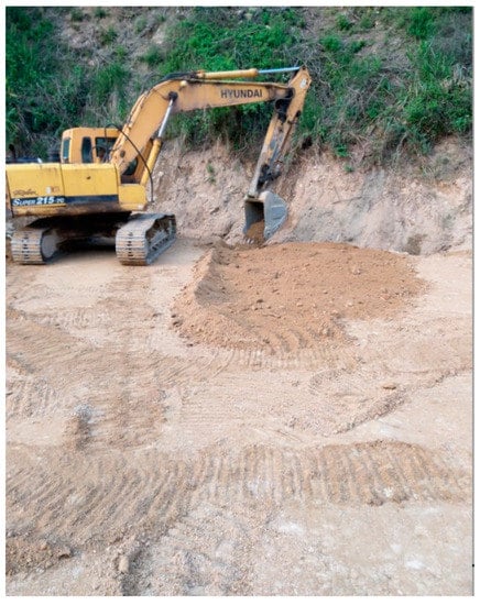 SRM was taken from the excavation site of Wuyi County, Zhejiang Province, as shown in Figure 1. The particle composition of SRM is shown in Table 1. SRM is usually divided into soil and rock. Generally speaking, particles smaller than 5 mm in diameter are considered soil, and those larger than 5 mm are considered rock []. The soil–rock ratio is the mass ratio of soil to rock. The properties of soil separated from the experimental SRM are presented in Table 2. It can be seen from the uniformity coefficient and coefficient of curvature the soil is a kind of cohesive soil.