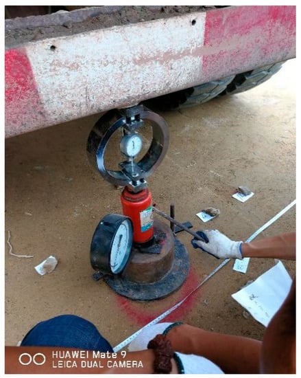 A comparison of mechanical properties between the laboratory-prepared SRM and field SRM subgrade was conducted, in order to recommend a more reasonable laboratory compacting method for SRM. The on-site subgrade constructed with SRM was compacted 6–8 times by the vibratory roller. The road for the field measurement was located in the Wuyi section of Wucheng-Wuyi Highway, G235 National Road, Jinhua City, Zhejiang Province, has a total length of 4.472 km, and a design standard of a two-way six-lane first-class highway. The subgrade was constructed with SRM. The resilient modulus and CBR of the subgrade in the field were tested. The required equipment in the test mainly included the loading equipment, jack, dynamometer, rigid bearing plate, and pavement deflectometer. The field test of the CBR is shown in Figure 15 and Figure 16.