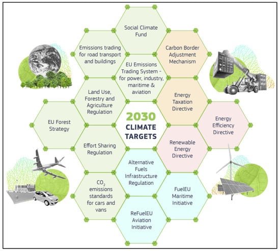 Moreover, the European Commission [] adopted a new environmental policy concept, the so-called “European Green Deal”. All Member States committed to turning the EU into the first climate neutral continent by 2050. To get there, they pledged to reduce emissions by at least 55% by 2030, compared to 1990 levels. This will create new opportunities for innovation, investment and jobs, such as markets for clean technologies and products, the electrification of the economy, the greater use of renewable energy and greater energy efficiency. The changes are expected in sectors such as energy, transport, engineering, construction and renovation, helping create sustainable, local and well-paid jobs across Europe. The whole framework of this policy concept, “The Fit for 55 package”, is illustrated by Figure 1.