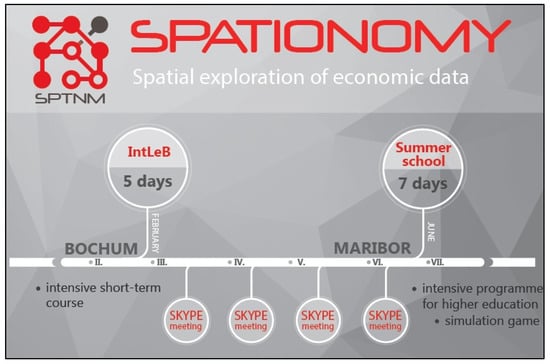 The project SPATIONOMY 2.0 aims to innovate the way of teaching the distinct fields of economics, business, geoinformatics and geography, all encompassed by game studies, via modern methods of informal teaching (gamification and playful education) and virtual telecollaborative techniques [,]. Generally, the project tackles the issue of learning-by-doing by playing a serious and scientifically based simulation game. In SPATIONOMY 2.0, the focus is on a higher level of integrating the students by their own creation of game rounds.