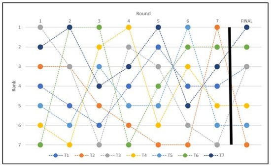 The results of the simulation game show a rather balanced performance of the teams. Theoretically the winning team can achieve the best score of seven times first place in every round (7 × 1); therefore, the best score is 7. The worst possible score is losing in all rounds and being last seven times (7 × 7); hence, the worst possible score is 49. Based upon this, the maximum difference between the first and last team is 42 points. The results are presented in Table 5.