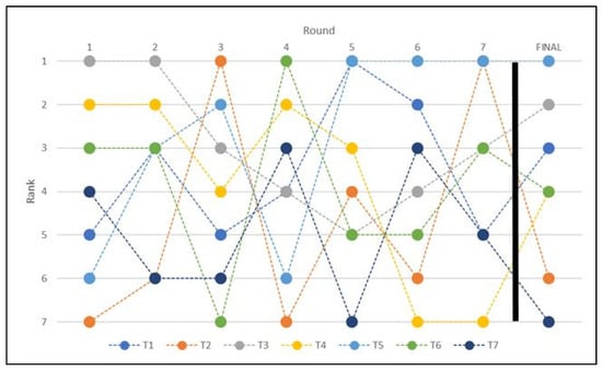 Similar procedures took place after each round: evaluating the teams based upon their work and the results they submitted to the academics. The overall score of the teams was calculated at the end of the simulation game. The results of the years 2018 and 2019 are presented in Figure 6 and Figure 7. While those figures may seem slightly chaotic, they represent the results of the teams during the rounds truthfully. The more diverse the lines are, the more teams alternated in being the first in a particular round while being the last in another round. The worst case scenario is a set of levelled parallel lines, which definitely did not occur. The rightmost part of both figures (separated by the thick black line) represents the final position of each team. In other words, the more peaks and valleys and sloped lines are in the figure, the more diverse the results of the teams during the game, and the more teams experienced success and failure as well.