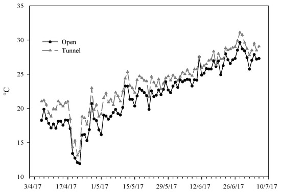 In particular, during the first growing phase (from sowing to the first ten days of May), the average air temperature was 4.1 °C higher under tunnels compared to the field; instead, in the other phases of the cycle, this difference was reduced to about 2.5 °C. This suggests that in cold periods, the tunnel is able to keep the temperature more constant, reducing the negative effect of low temperatures. Indeed, Jayalath et al. [29], in their research carried out in Georgia during spring, also reported an average temperature increase ranging from 0.5 to 1.6 °C in protected conditions (tunnel) compared to the open air; in addition, they detected that on the coldest mornings of the experiment, the tunnel maintained temperatures 3.0 to 5.0 °C higher than the field, highlighting its ability to mitigate cold temperatures.