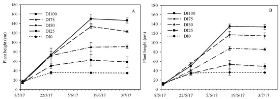 Plant height during the crop cycle as affected by five irrigation levels (DI100 = 100%, DI75 = 75%, DI50 = 50%, DI25 = 25%, and DI0 = 0% restoration of water lost by evapotranspiration) in the two environments (PE = high temperatures (A) and OF = ordinary temperatures (B)).