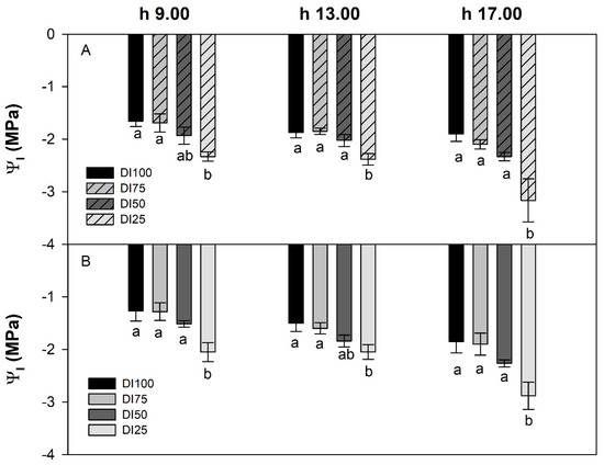 Water potential can vary noticeably, depending on the drought stress level and on environmental conditions. However, in our study, the daily course of leaf water potential measured in the morning, at midday, and in the afternoon had a similar pattern when comparing the environmental condition, with only the DI25 treatment reaching the lowest levels under both the tunnel and in open field conditions (Figure 4A,B).