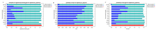 Results of the jackknife test of variables’ contribution in modeling H. japonica’s potential habitat distribution. Regularized training gain (A); AUC (B) and test gain (C). The blue bars indicate the gain using solo environmental variable, the green bars indicate the gain excluding the single variable from the full model, and the red bars indicate the gain considering all variables.