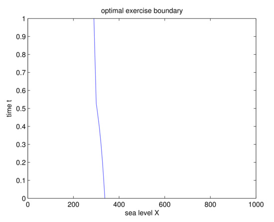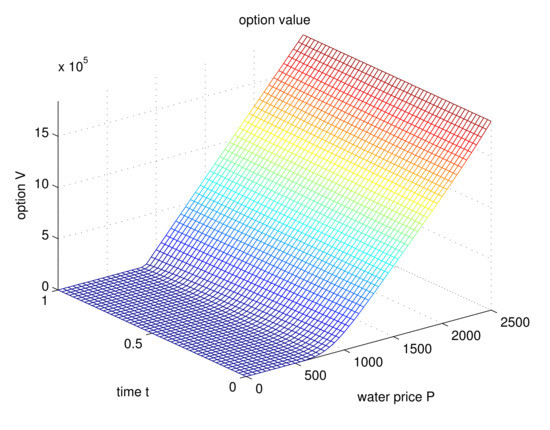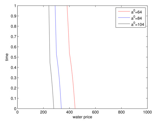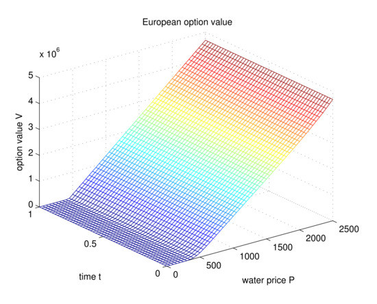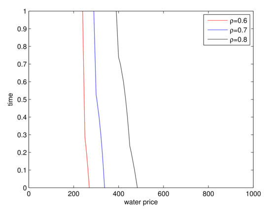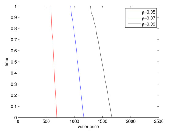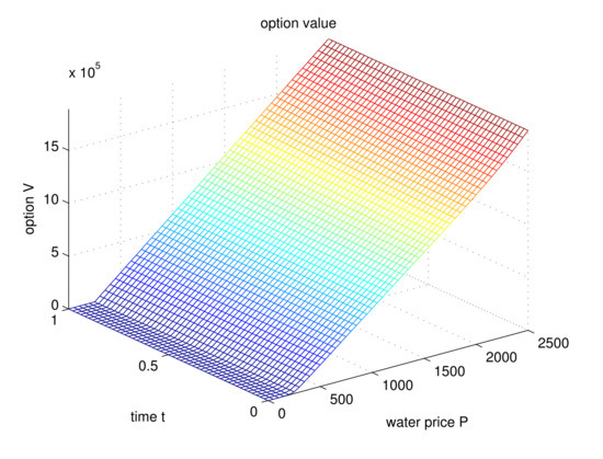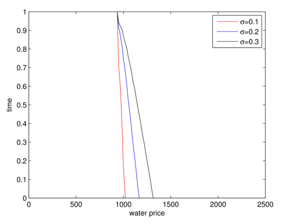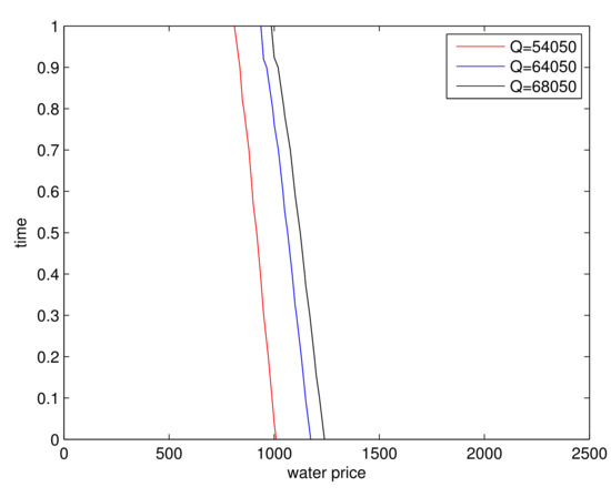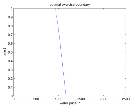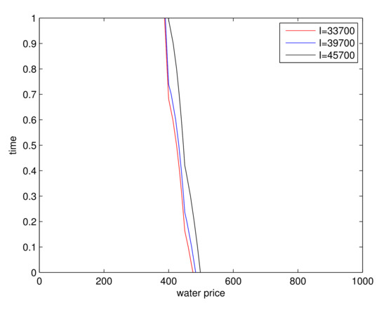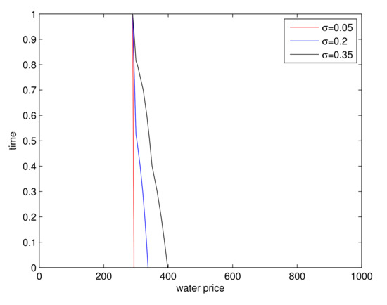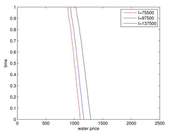 Now, we take Kaizhou District adjacent to Wanzhou District for the experiment object to the American real option. We find that the water price in Kaizhou District is 1000–2500 yuan per ton. The water-saving efficiency is increased to 30 percent due to the new irrigation technology. Then we choose million liters per year where the total agricultural water consumption in Kaizhou District is 280 million liters per year. Besides, the total operating cost and the total investment cost of agricultural water management in the Kaizhou District are 11,910 and 39,700 thousand yuan, respectively. Thus, we choose 11,910 and 39,700. According to [19], some important invariant parameters are given in Table 4.