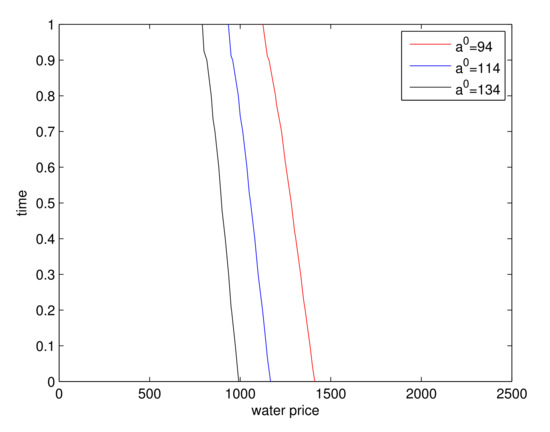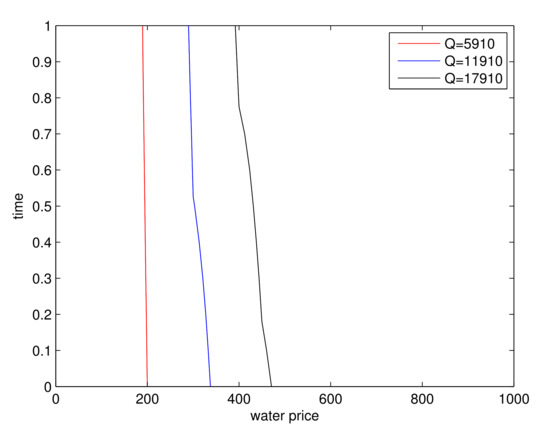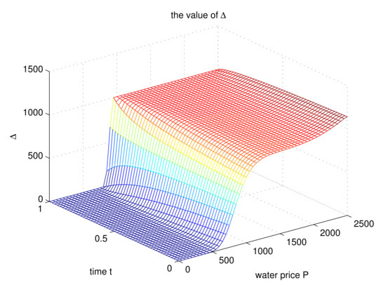 Now, we are in the position to carry out an empirical study where we take Wanzhou District of Chongqing City as an example to strengthen our theoretical analysis. We find that the water price in Wanzhou The district is 1000–2500 yuan per ton. Based on the new irrigation technology, the water-saving efficiency is increased to 30 percent. Then we choose million liters per year where the total agricultural water consumption in Wanzhou District is 380 million liters per year. In addition, the total operating cost and the total investment cost of agricultural water management in Wanzhou districts are 64,050 and 91,500 thousand yuan, respectively. So, we choose 64,050 and 91,500. According to [19], some important invariant parameters are given in Table 1.