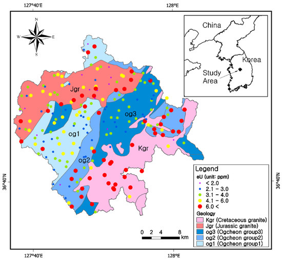 The mean uranium concentration (3.8 ppm) in Jgr of the study area was similar to that measured previously in other Jgr areas in Korea, such as in Daejeon, located in the west-central part of Korea (3.72 ppm; [28]). However, the mean uranium concentration of Kgr (7.5 ppm) in the study area is higher than those in Jgr areas. The high uranium levels in Kgr compared to Jgr are due to the characteristic compositions of Kgr, which contains significantly more acidic rocks than Jgr does [32]. As shown in Figure 1, high uranium concentrations are remarkably distributed in the Kgr granite area, or less commonly near geological boundaries between granitic rocks and metamorphic rocks.