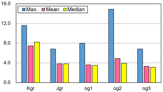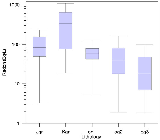 Although the mean value of groundwater radon concentration was highest in Jgr groundwater throughout the Korean peninsula [43], it was highest in Kgr (median, 345.9 Bq/L) in this study; the median concentration in Jgr was only 84.4 Bq/L. Furthermore, the median values in og1 and og3 were low, at 59.6 and 17.9 Bq/L, respectively (Table 1; Figure 6). The median concentration in og2 groundwater was only 38.1 Bq/L, despite the presence of a high uranium-bearing coal bed in part of og2 [24]. The groundwater radon concentrations in og1, og2, and og3 were low relative to those in granite (Jgr and Kgr) because the uranium concentrations in the groundwater in the metasedimentary rock areas were lower than those in the granite groundwater. Because the metasedimentary rocks are less permeable than granite, radon emanation from the former is less [45].