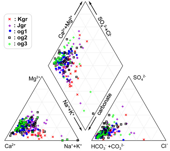 Figure 3. Water types plotted on the Piper diagram showing variations according to geology. Kgr: Cretaceous granite; Jgr: Jurassic granite; og1: Ogcheon metasedimentary rocks 1; og2: Ogcheon metasedimentary rocks 2; og3: Ogcheon metasedimentary rocks 3.
