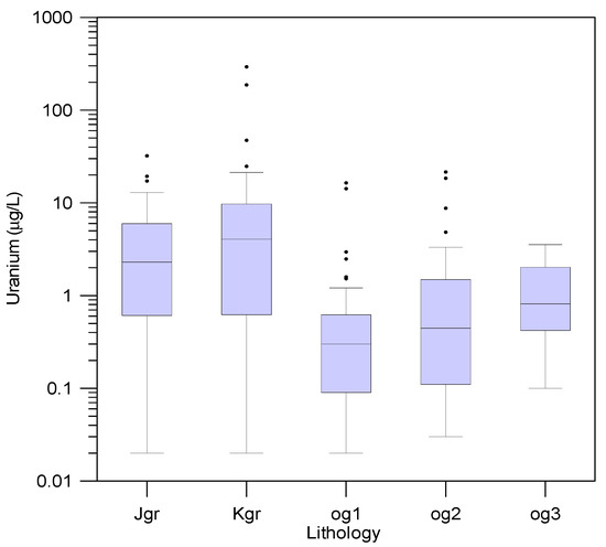 Figure 5 shows the spatial distribution of uranium concentrations in the 200 groundwater samples. Three out of four samples with uranium concentrations >30 μg/L were located in the Kgr area. Most of the groundwater samples with concentrations of 3–30 μg/L were located in the Kgr and Jgr areas, whereas the concentrations in og1, og2, and og3 areas were <3 μg/L. The differences in the groundwater uranium concentrations are consistent with previous reports of generally high uranium concentrations in groundwater in granite areas, and low concentrations in groundwater in sedimentary and metamorphic rock areas [14]. Although a high uranium-bearing coal bed passes through a part of the og2 area, the median uranium level in og2 groundwater was only 0.45 μg/L.