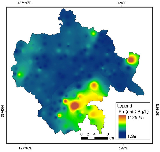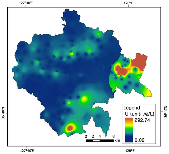 Spatial concentration distribution maps of uranium and radon were constructed using inverse distance weighting (IDW), which is an interpolation method that applies the principle that the closer the distance to a known point is, the more similar the value is when predicting the value of an unknown point [40].