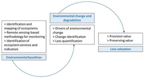 In addition to evaluating changes in ecosystems and their services, various methods have also been used to convert ecosystem service provision to economic values [1,3,9,29,30,31,32]. The economic valuation elements that are specific to ecosystem service gain/loss are productivity loss, benefit transfer methods, replacement cost, avoidance cost, restoration cost and mitigation cost (e.g., [29,32,33]). This information can then be used for cost–benefit analysis to inform management decisions on ecosystem conservation or exploitation (e.g., [5,30,34,35]). The quantification of ecosystem services at a regional scale using ground surveys is problematic because it depends on the sampling strategy employed and the specific types of ecosystem services under examination, and systematic surveying in the field is time-consuming and expensive. Moreover, conversion of these services to economic values needs robust methods to be applied to minimize the economic valuation cost and provide a consistent methodology for continuous observation of the area under investigation [36,37].