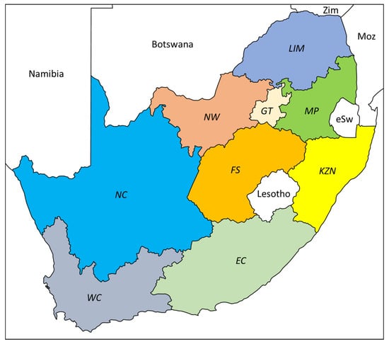 Map of the nine provinces of South Africa which, from west to east, are: NC = Northern Cape, WC = Western Cape, NW = North West, FS = Free State, EC = Eastern Cape, KZN = KwaZulu-Natal, GT = Gauteng, MP = Mpumalanga, LIM = Limpopo. Also shown are Zim = Zimbabwe, Moz = Mozambique, eSW = eSwatini (Swaziland).