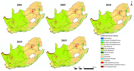 Land-cover maps for South Africa for 2001, 2005, 2010, 2015 and 2019.