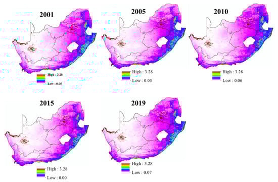 Equation (1) was used to calculate ecosystem service values based on global published values [3,14,56]. Results are presented in Table 4. This shows an annual value for ecosystem service provision in South Africa, averaged across the five time slices, of USD 437.727 billion. This compares with the national GDP (2019 values) of USD 351 billion; therefore ecosystem services represent some 125% of GDP. Table 4 also shows the different contributions to this national total by the different provinces. This ranges from the highest value in the Northern Cape (35.86% of total national ecosystem service values) to the lowest in Gauteng (1.45% of total national ecosystem service values). These two contrasting provinces, however, represent different end members of total contribution to GDP, with Northern Cape containing 2.15% of the national population and 2.19% of its GDP and Gauteng 25.82% of the national population and 34.94% of its GDP. This clearly shows—in these specific provinces—an opposite relationship between ecosystem service values and economic output values. (Other provinces show more similar values compared to Northern Cape and Gauteng.) The significance of this analysis is discussed below. Spatial patterns of ecosystem service values are shown in Figure 9. These show generally higher values in the west and lower in the east, consistent with spatial patterns of land-cover types (Figure 4). Smaller-scale and isolated patches of bare land and wetlands are also present, and these can be considered as anomalies set within broader landscape patterns.