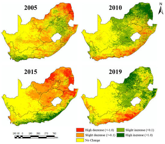 In detail, these data can be used to identify net patterns of land degradation (decrease in NPP) or restoration (increase in NPP) between successive time slices (Figure 8). These results show a consistent trajectory of land degradation in regions of Northern Cape, Western Cape and Eastern Cape. Other areas show some limited phases of degradation (Free State, North West, Limpopo) separated by periods of no change. There is also an antiphase relation between land degradation patterns between the 2010–2015 period and the preceding and subsequent periods, consistent with widespread aridity in 2015 (e.g., [65]).