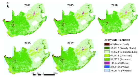 Spatial patterns of economic valuation of ecosystem services (USD ha−1 yr−1) in South Africa for the years 2001, 2005, 2010, 2015 and 2019.