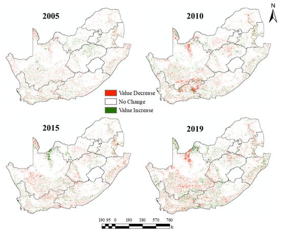 The valuation of each land-cover class was estimated based on global published values for ecosystem services (e.g., [2,56]) as updated and summarized by [3] who integrated data from questionnaires and field workshops in various locations and from different ecosystems globally. Reference [3] (their Table 3) lists unit values in USD ha−1 yr−1 for different biome types for the years 1997 and 2011. Here, we used the averaged values for each biome to calculate ecosystem service values for the equivalent land-cover types from the MODIS data (Table 1). Many of these previous studies of land-cover valuation focused in particular on arid and semi-arid ecosystems and are thus relevant to land degradation studies in water-stressed locations such as South Africa. Previous use of MODIS data for calculating NPP shows statistically significant results [57], and this can frame the use of these data in this study as a direct indicator of land degradation. The NPP information was obtained from MODIS product at 500 m pixel resolution. The NPP values (in kg C m−2) were calculated based on the summation of the daily gross primary productivity (GPP) after subtracting the annual respirational factors [58]. The respirational factors were defined based on the characteristics of each biome using the Biome Properties Look-Up Table (BPLUT) (e.g., [59]). Four NPP product scenes were required to cover the South African terrestrial area for 2001, 2005, 2010, 2015 and 2019. The scenes were mosaicked and clipped using the national South African boundary layer.