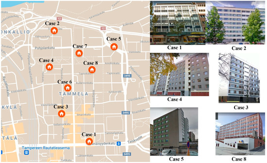 The selection of buildings was largely based on the data availability. Often the actual building energy use data after renovation were not easy to obtain. Eight projects were used in this study to control the variables of building size, age, building system used, and local climate condition. All eight buildings are located in the same city and were built around similar periods, with the energy retrofits mainly focused on the buildings’ heating system and exterior façade. Demonstrated in Figure 1 the eight buildings were part of the “European cities serving as Green Urban Gate towards leadership in sustainable energy” (EU_GUGLE) project [16]. The project aimed to demonstrate the feasibility of a nearly zero energy building renovation target; it started in 2013 and lasted for six years. Six pilot cities from Italy, Austria, Finland, Denmark, Estonia, and Slovakia participated in the project. Around 200,000 m2 of gross floor area was renovated and targeted primary (source) energy savings of up to 82%. Eight buildings in Tampere, Finland, participated in EU_GUGLE. All eight buildings are in the Tammela district, a traditional residential district close to the city center and railway station. There is a total of around 299,000 m2 of existing building stock in Tammela district. The current average energy use intensity is 213 kWh/m2, and the target intensity is 160 kWh/m2 [17], around a 25% operating energy reduction.