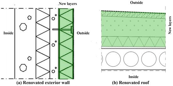The primary existing structural systems and materials used in the studied buildings are listed in Table 2. As illustrated in Figure 2a, during the renovation, additional insulation was attached directly to the existing external wall structure; then, new plaster was painted over the insulation for protection. For calculation, the same renovated wall type was used for all the case buildings, but the thickness of the added insulation varied according to the information found on the project website and provided by the project team. Not all case buildings had renovated roofs. For those buildings that did, three additional layers were added: a new polyurethane insulation layer, a light gravel layer, and lightweight concrete (functions as insulation). In addition, a new double layer bitumen membrane was added for waterproofing (refer to Figure 2b and Table 2). The existing exterior windows and doors were mainly made of wooden frames, and all case buildings had them replaced with more energy-efficient exterior windows and doors.