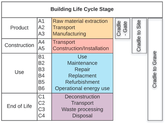 The software One Click LCA™, developed by the Finnish private company Bionova Ltd., was chosen for this study [21]. The software complies with EN 15987 and EN 15804 standards [17], and EN 15804 is a guideline for Environmental Product Declarations based on the ISO 14044 standard. One Click LCA includes the building material database, which is European original and Finland specific [22]. In this project, life cycle carbon emissions were calculated for individual case projects. To normalize the added embodied energy, only renovated components were included: the building envelope, heating/ventilation system, and lighting system. Structural systems and other building service systems were excluded, as they were not changed. Furniture and interior finishes were excluded as well. The life stages included in this study were A through C. As illustrated in Figure 3, stage A is the product and construction stage and includes A1 through A5. A1 through A3 is usually called “cradle to gate,” and A1 through A5, “cradle to site.” Stage B is the use stage, and stage C is the end-of-life stage. A1 through C3 are typically named “cradle to grave.” The data used to create the LCA model were extracted from original construction documents provided by the project team and the author’s visual inspection on site. Information extracted from the EU-GUGLE website, publications, presentations, and other available information can be found online. A life span of 50 years was used for the calculation, and the product service life was set as the default; for example, wood panels, the roof, and windows were set to be replaced once during the building’s lifetime (50 years), and doors were set to be changed twice during the building’s lifetime. In addition, in the One Click LCA database, transportation carbon was included during the production stage [23].