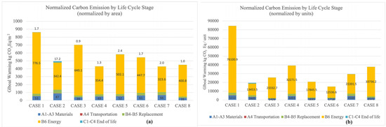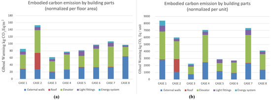 A1–A3 had the second highest life cycle stage contributing to life cycle emissions; this contribution was mostly related to the selection and production of building materials, components, and systems (refer to Figure 4). Then, we looked at the life cycle carbon derived from building materials and systems during the production and construction life stages. Figure 6a shows normalized carbon emissions (per floor area) during A1–A5 stages, which we defined as embodied carbon. The external wall was the dominant category contributing to embodied carbon, and the elevator core ranked second. The only outlier was case 2, where the elevator and roofing systems were the main contributors to the added embodied carbon. Figure 6b shows that the results of normalized carbon by unit counts were different: Case 1 ranked first with the highest per unit carbon emissions from building systems and materials used for the energy retrofit, followed by case 7 and case 4. Again, these different results demonstrate the need to potentially use occupants or unit counts as a normalization unit.