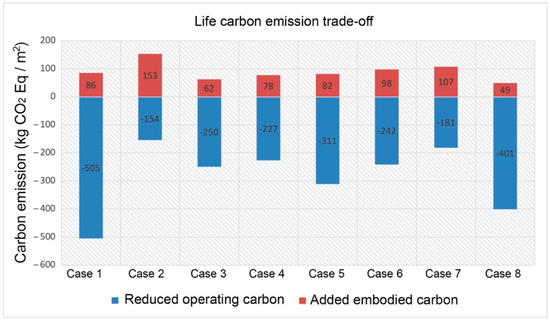As illustrated in Figure 5, for embodied carbon, case 1 had the highest increase per floor area, followed by case 2 and case 6. For the offset embodied carbon through an operating energy reduction, case 2 had the highest life cycle carbon reduction, followed by case 1 and case 7. Regarding the balance between a carbon increase and offset, all case buildings had negative life cycle carbon, which is an indicator that an energy retrofit is effective in reducing the life cycle carbon emissions of existing buildings. However, if we only look at the offset carbon emissions through an operating energy use reduction, case 1 ranks first, followed by cases 2 and 6. Despite the highest life cycle carbon emissions (refer to Figure 4), as showed in Figure 5, case 1 had the highest life cycle carbon reduction compared to the base condition before the energy retrofit. These different ranking results illustrate how evaluating sustainability using different portions of the life cycle of carbon can have different results; hence, the decisions based on the analysis results may vary.