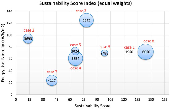 The sustainability score was first calculated using equally weighted OES, EMB, and ECO. As illustrated in Figure 7, the X-axis represents the sustainability score (unitless), and the Y-axis is the energy use intensity after renovation, measured in kWh/m2. The size of the bubble represents the total floor area of the case building, measured in m2. For example, case 8 had a gross floor area of 6060 m2, represented by the biggest circle. In general, the higher the sustainability score, the less the overall life cycle carbon emissions emitted from the renovated building, and the more sustainable the building.