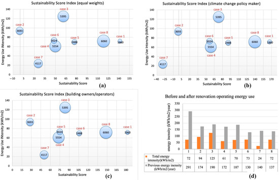 Figure 8. Sensitivity analysis. (a) is the sustainability score with equal weights; (b) is the sustainability score by climate change policy maker; (c) is the sustainability score by building owners; (d) is the before and after renovation operating energy use.