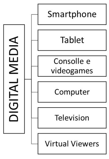 Several studies have investigated strategies to increase the level of physical activity among children, in particular during this pandemic. One of the suggested alternative ways that can help to reduce physical inactivity is digital media, which are known as the set of means of communication that concentrate on digitized technologies on computers and networks. Smartphones, TVs, tablets, consoles, and video games are the most popular among school-age children (3–10 years) (Figure 1). Although the benefits and disadvantages of these devices on psychosocial function and physical health are unclear, the question has been raised regarding whether digital media can affect the mental and physical health of children and adolescents [9].