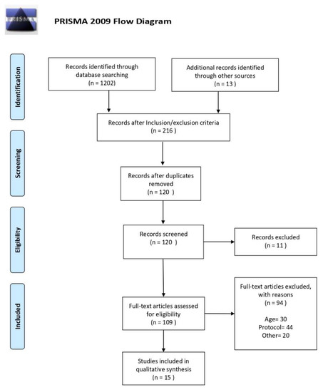 A total of 1202 studies were identified through a preliminary database search. A total of 216 studies were selected after the inclusion/exclusion criteria. A total of 123 studies were obtained after eliminating the duplicates, and after being screened. 112 full-text articles were assessed for eligibility. Of these 112 full-text articles, 94 items were excluded with reasons. These included age of participants, protocols without physical activity, or other reasons incompatible with the inclusion criteria. Therefore, 15 studies [18,19,20,21,22,23,24,25,26,27,28,29,30,31,32] were included in the qualitative synthesis (Figure 2).